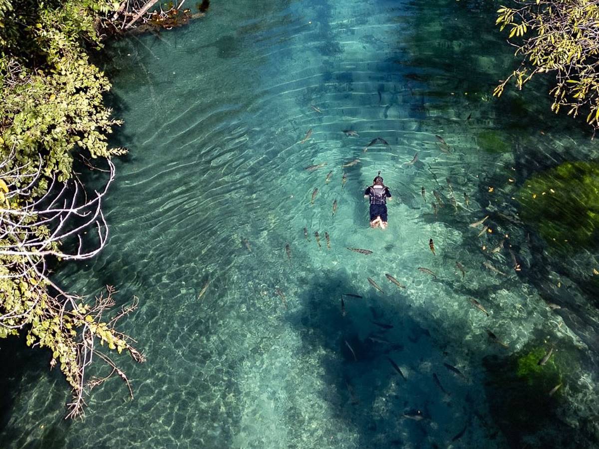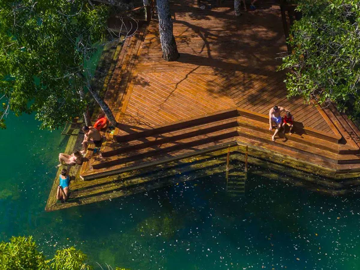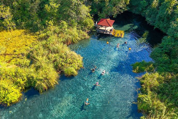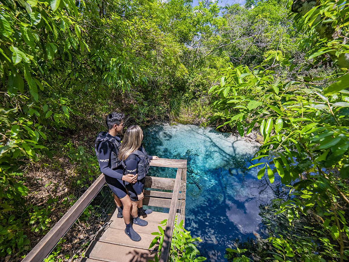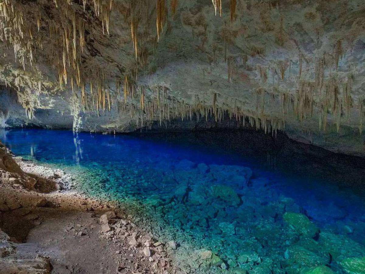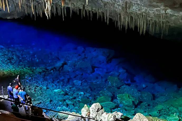 No fundo da caverna, os visitantes encontram um lago subterrâneo de águas extremamente transparentes, com impressionantes formações calcárias submersas. O passeio inclui um tranquilo trajeto de bote e a inesquecível experiência de flutuação, que permite observar de perto a beleza subaquática do local em um ambiente de silêncio e contemplação.