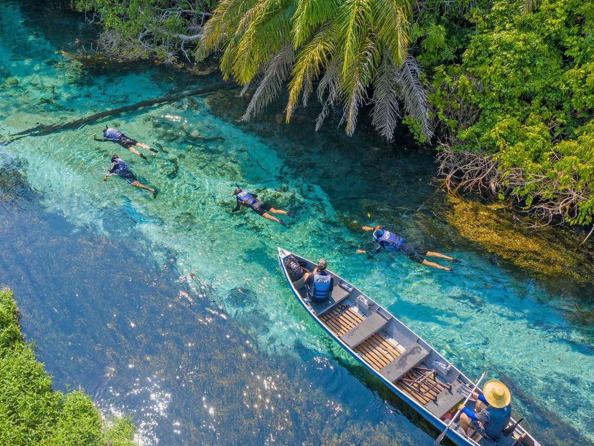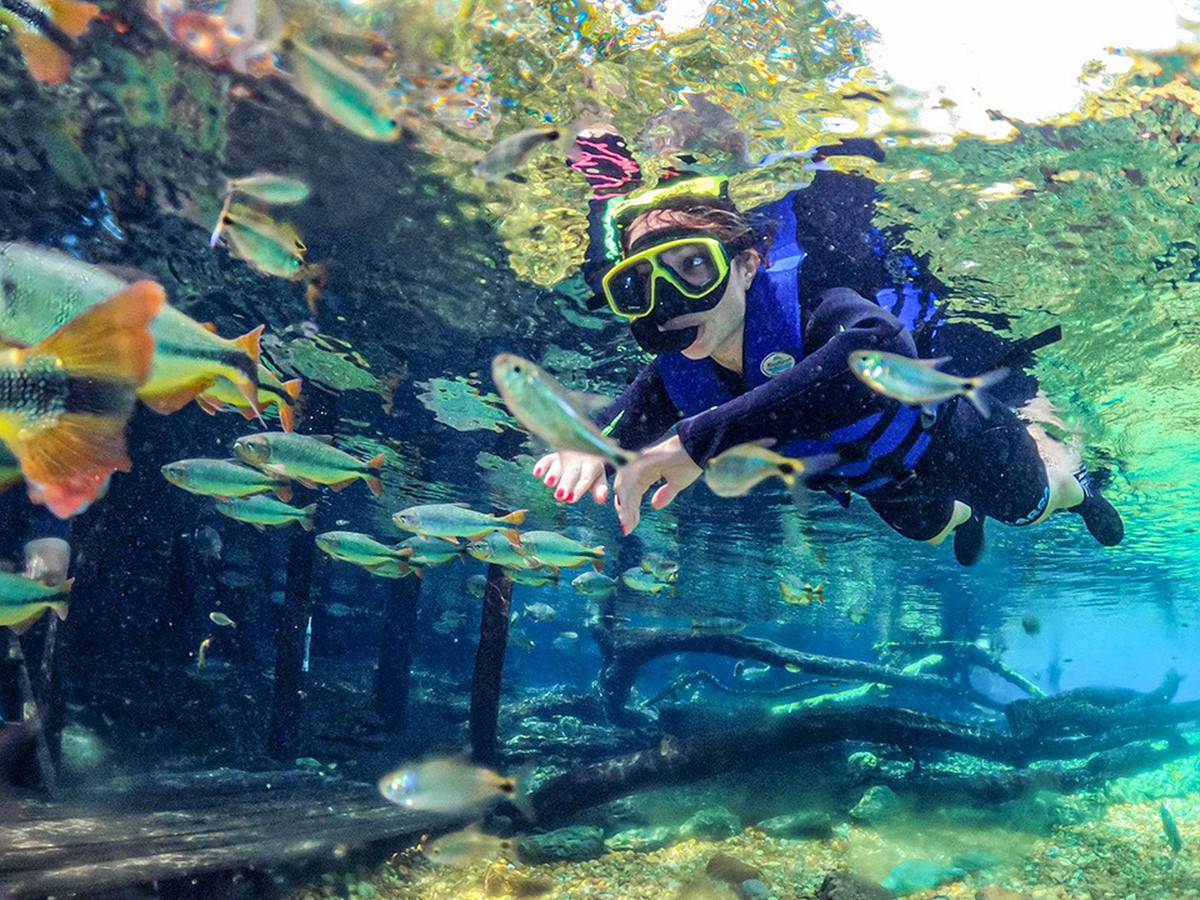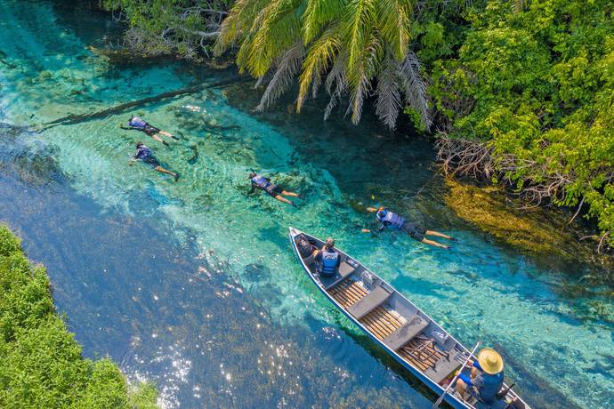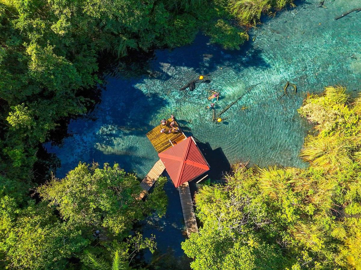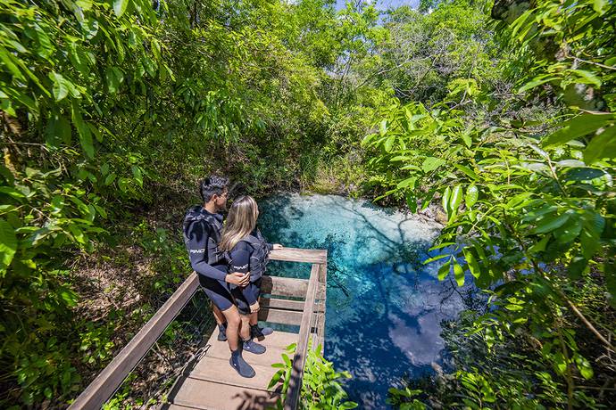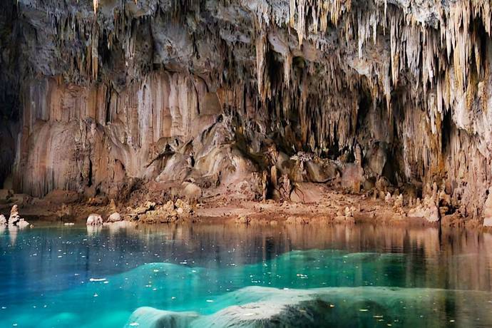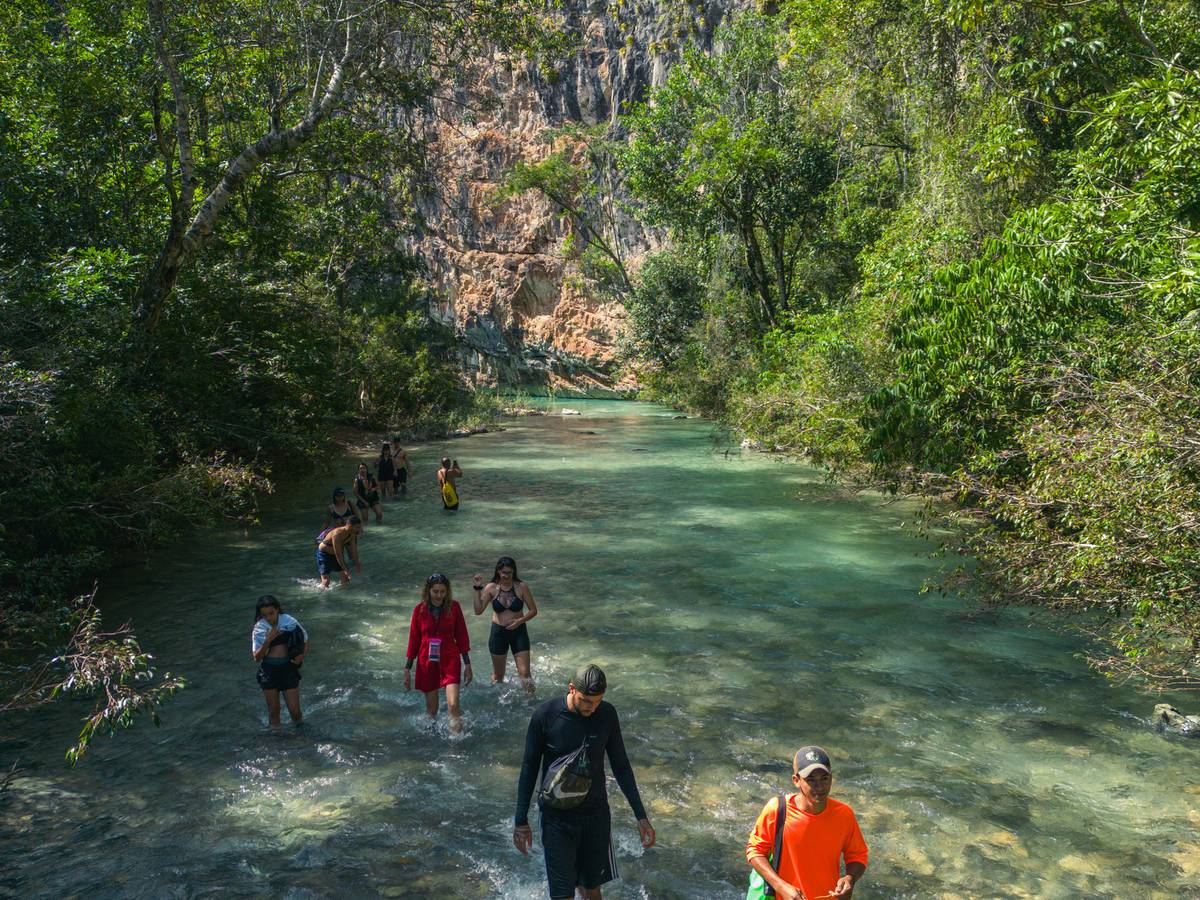 No fundo da caverna, os visitantes encontram um lago subterrâneo de águas extremamente transparentes, com impressionantes formações calcárias submersas. O passeio inclui um tranquilo trajeto de bote e a inesquecível experiência de flutuação, que permite observar de perto a beleza subaquática do local em um ambiente de silêncio e contemplação.