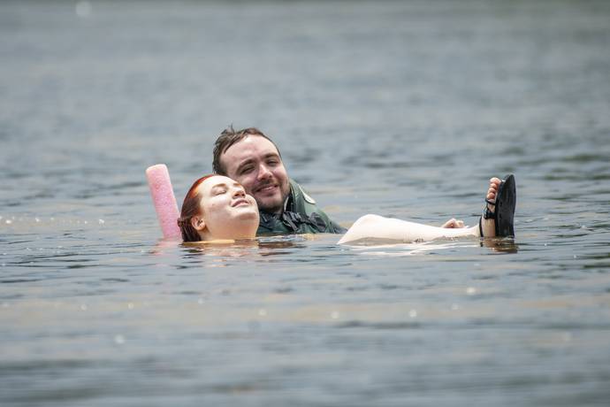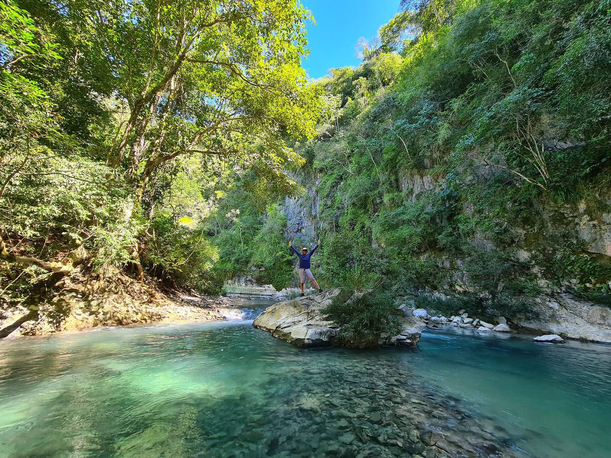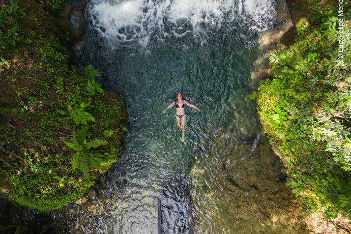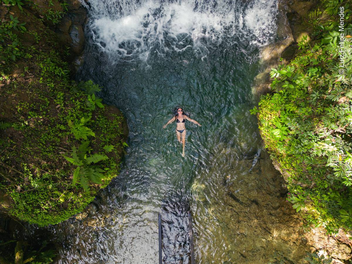 Banhos refrescantes nas cachoeiras do Rio Chapeninha, com direito a tirolesa e plataforma de salto.