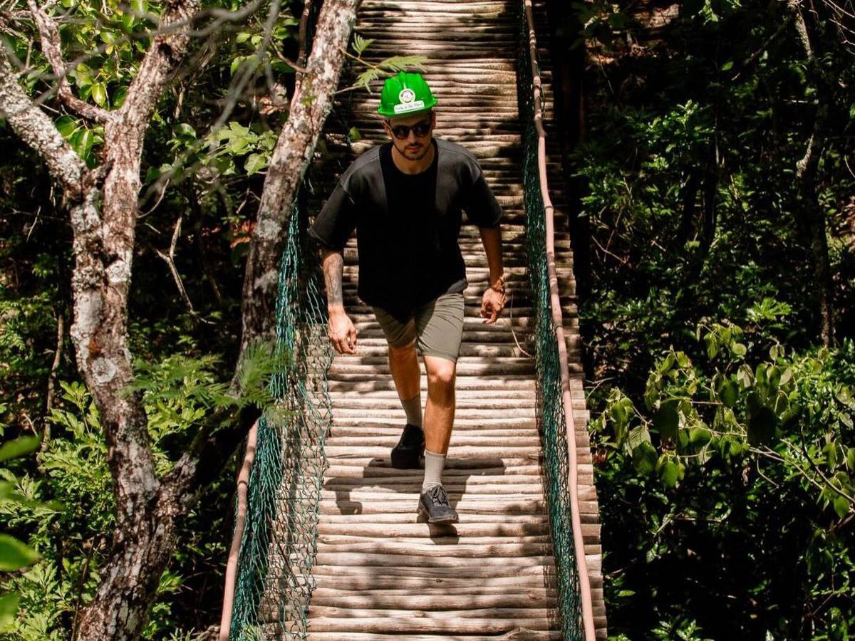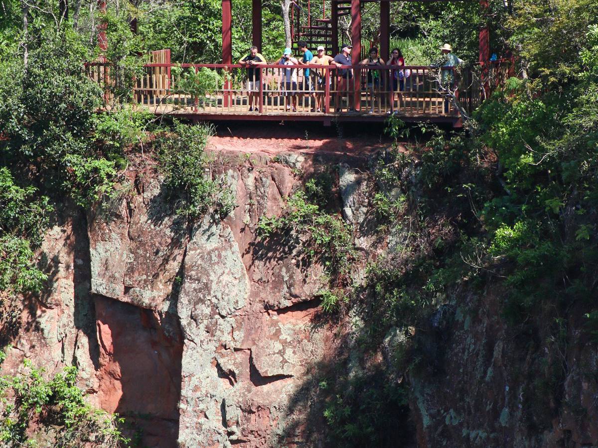 Trilha suspensa por passarelas entre as árvores até a entrada das grutas.