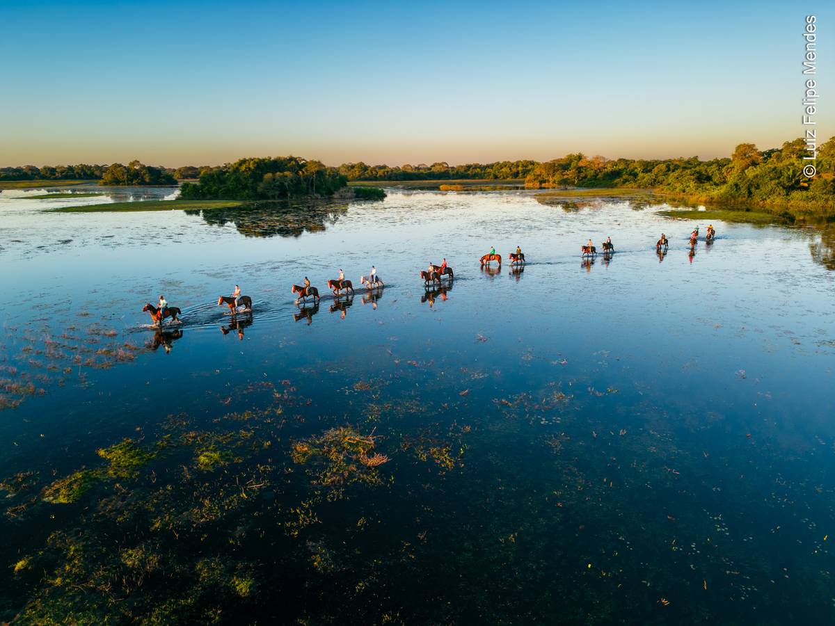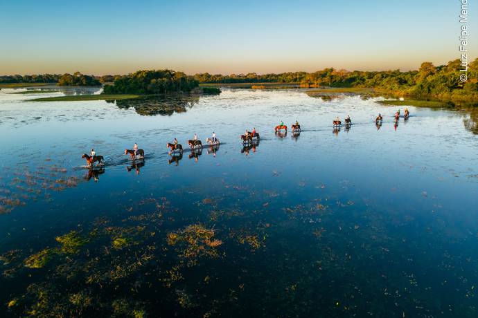 Cavalgada em ritmo contemplativo por campos naturais, trilhas sombreadas, áreas alagadas e matas de buritis, integrando Pantanal e Cerrado.
