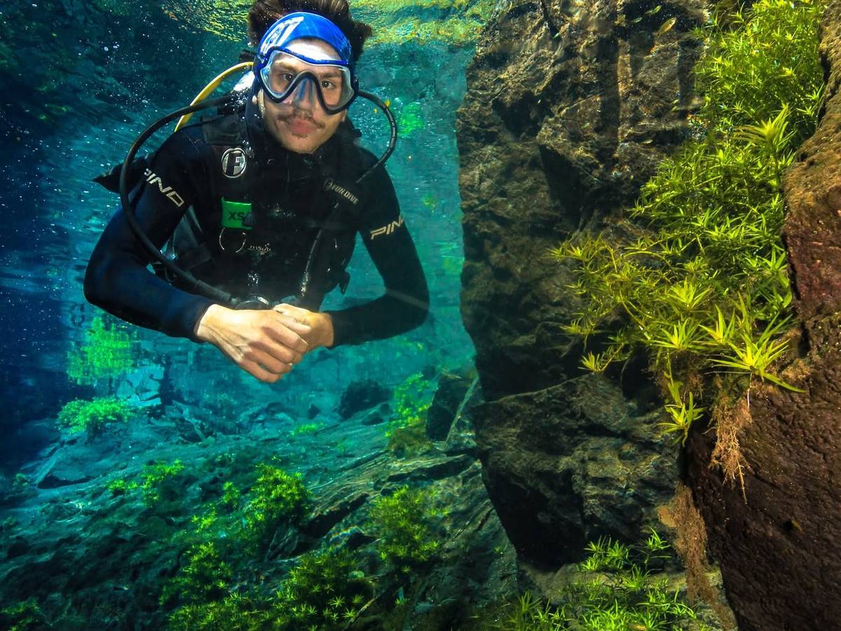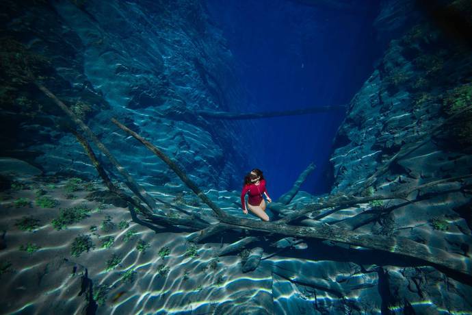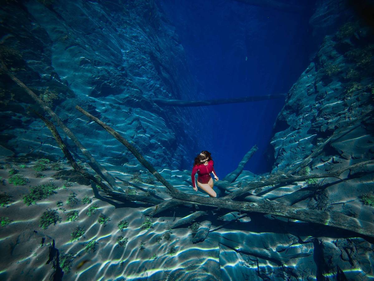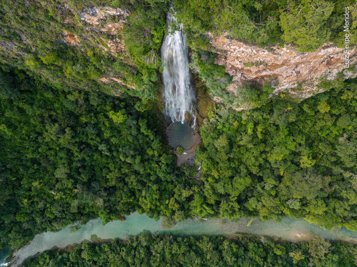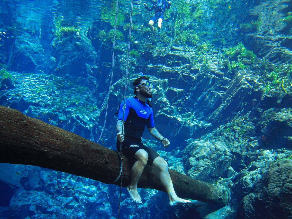 A aventura no Abismo Anhumas começa com uma descida vertical de 72 metros em rapel elétrico guiado, feita com total segurança, até um grande salão subterrâneo. Lá embaixo, a luz natural refletida nas águas cristalinas cria um cenário único.