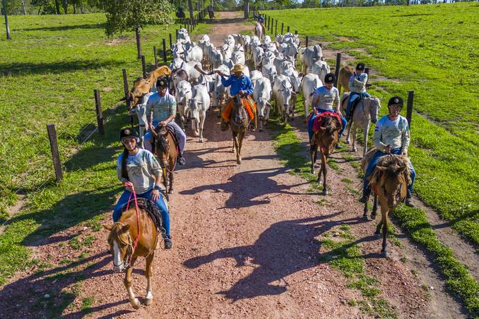 Participação na lida com o gado, acompanhando uma comitiva real e aprendendo as técnicas, sons e comportamentos que fazem parte do trabalho dos peões pantaneiros
