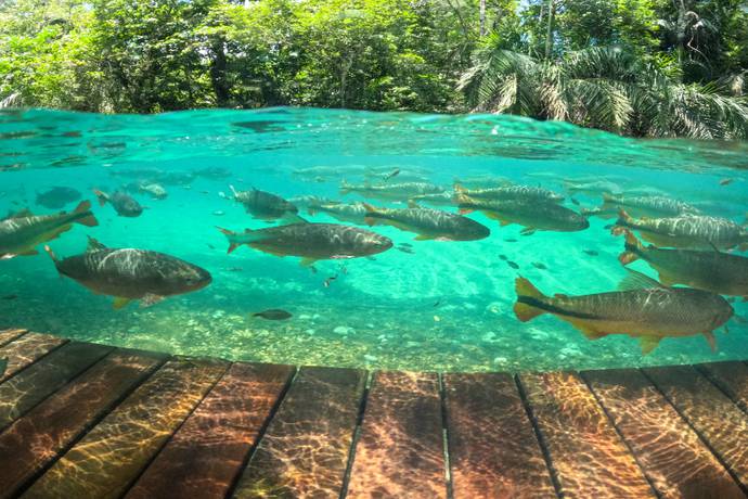 Vivencie o Encontro das Águas, observando o contraste entre a transparência do Salobra e as águas turvas do Rio Miranda.