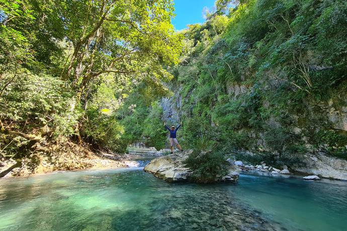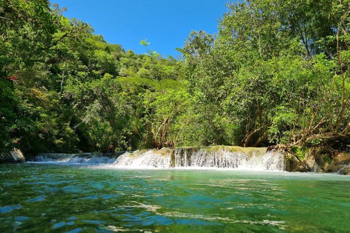 Caminhada pela mata ciliar com várias paradas para banho em cachoeiras e piscinas naturais ao longo do rio.
